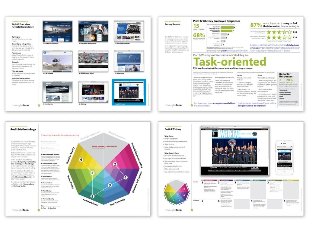 ThoughtForm summarized an eight-point audit of the existing site in a document that was then used to guide the discussion about recommended changes with Pratt & Whitney.