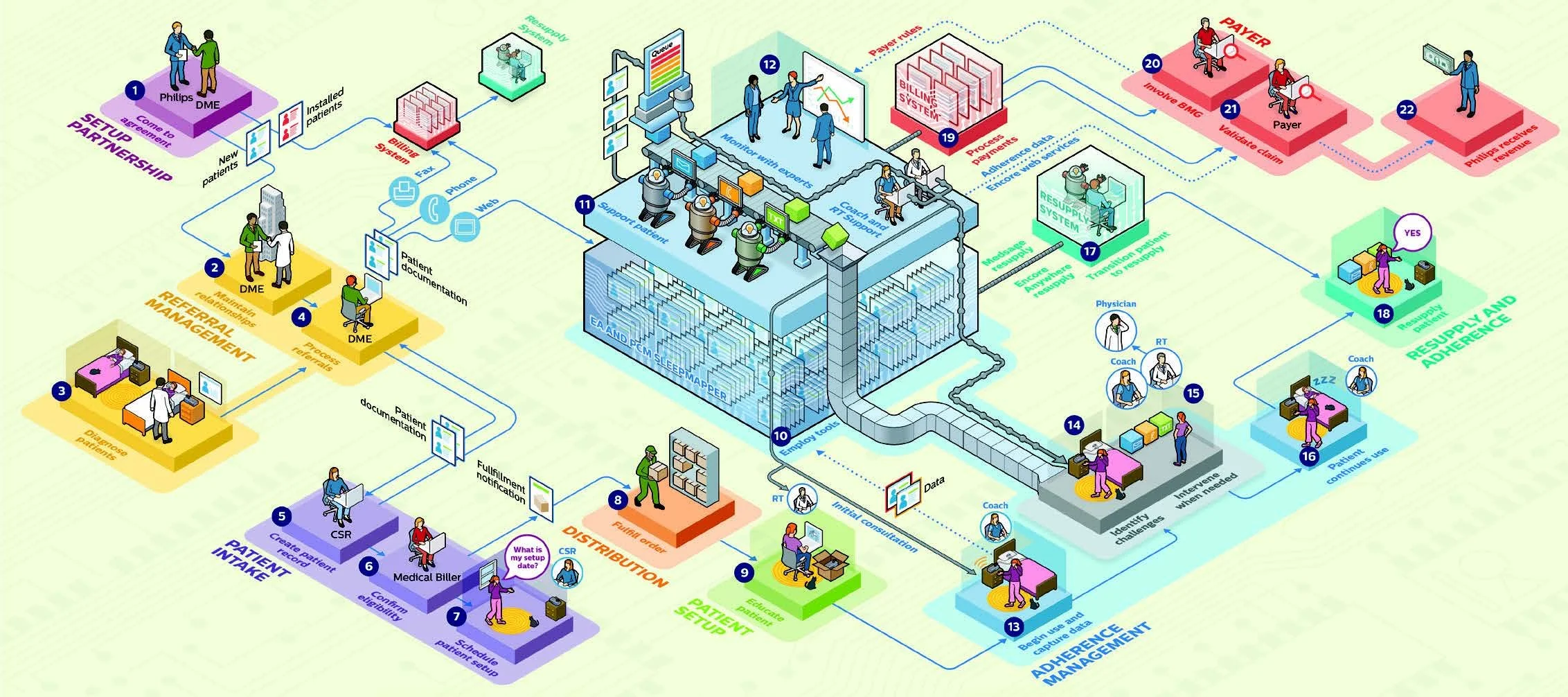 ThoughtForm met with the Philips team and used visual thinking facilitation techniques to understand the essential criteria and system pieces of the new business model. Creating a series of napkin sketch drafts of the visual model allowed the project team to explore different storytelling structures and refine key messages. Along the way, ThoughtForm helped Philips refine their overall approach to the service offering and begin to define details of the implementation.
