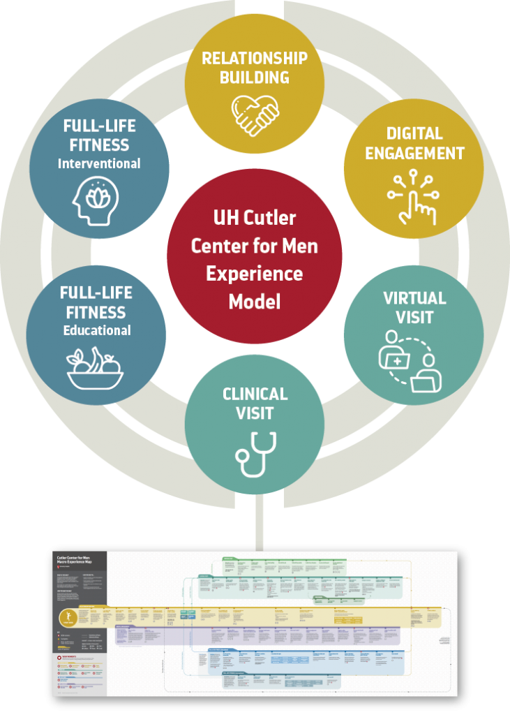 As a result of this work, the UH Cutler Center for Men has a strong foundation for further development. Created early in the project, the ethos statement centers on the idea of empowering men, and serves to guide the entire men’s health experience. A 65-page service model now provides a knowledge base for patient-facing staff. A master experience map details the full experience through dozens of touchpoints, highlighting the make-or break “wow” moments. An ecosystem map centers the UH Cutler Center for Men in a larger context, illustrating the resources and relationships at University Hospitals that fully enable it. As a whole, the experience dismantles the barriers that stop men from seeking care offering men-oriented incentives in their place.